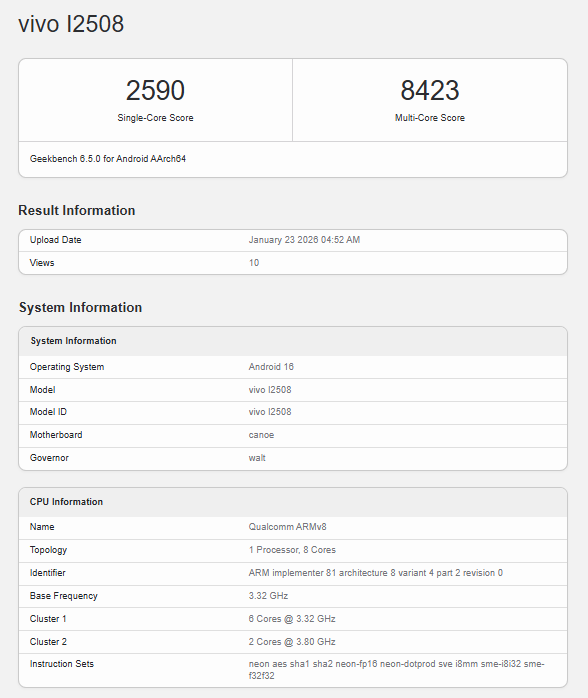 ベンチマークスコアはシングルコア2,590、マルチコア8,423を記録。現行のフラッグシップに迫るこの数字を、最上位のEliteモデルではないチップで叩き出している点に、クアルコムの底力が垣間見える。