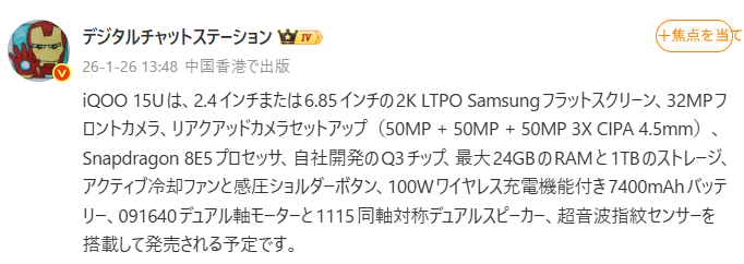 スマホがゲーム機の領域を完全に侵食し始めた。2026年2月4日に正式発表を控えるVivo「iQOO 15 Ultra」は、通信機能を備えた小型PCと呼ぶべき異次元のスペックを誇る。その核心は、従来のスマートフォンの限界を軽々と超えていく。