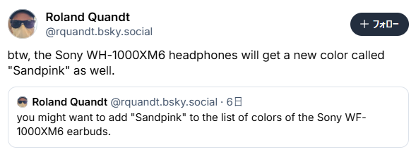 情報の出所は、モバイル業界で高い信頼度を誇るリーカー、Roland Quandt氏だ。彼がBlueskyに投稿した内容によれば、ソニーはWH-1000XM6のカラーバリエーションとして、サンドピンクを開発中だという。画像こそまだ公開されていないが、先代WH-1000XM5で人気を博した「スモーキーピンク」の系譜を継ぐ、肌馴染みの良い淡い色合いになるはずだ。