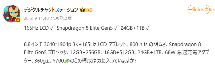 Weiboでの公式発表と著名リーカーDigital Chat Stationの情報を総合すると、新型Y700はゲーマーが長年求めてきた「理想の板」を具現化したものになりそうだ。