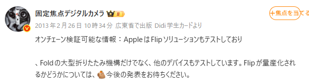 しかし、今回浮上したのはその「次」の矢だ。BloombergのMark Gurman氏や、サプライチェーン情報に詳しいFixed Focus Digitalからのリークによると、AppleはGalaxy Z FlipやMotorola Razrのような、正方形に近いコンパクトな形状へ折りたためる「iPhone Flip」の試作機テストを行っているという。