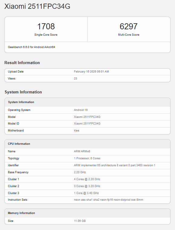 ベンチマークサイトに登録されたモデル番号「2511FPC34G」。末尾のGが示す通り、これはグローバル展開を見据えたモデルだ。心臓部にはMediaTekのDimensity 8500を採用。構成はプライムコア1基、パフォーマンスコア3基、省電力コア3基に加え、GPUにはMali-G720 MP8を搭載する。かつて噂された最上位のDimensity 9500番台ではなく、あくまで「Pro」としての堅実な構成に落ち着いた形だ。