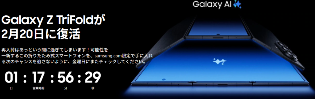 米国で「幻」と化したサムスンの3つ折りスマートフォン、Galaxy Z TriFoldが市場に戻ってくる。1月30日の初回販売ではわずか30分未満で完売、その入手困難さが話題を呼んでいた。この超ハイエンド端末の販売再開が2月20日に決定した。単なる在庫補充ではなく、サムスンが仕掛けるプレミアム戦略の一端が垣間見える動きだ。