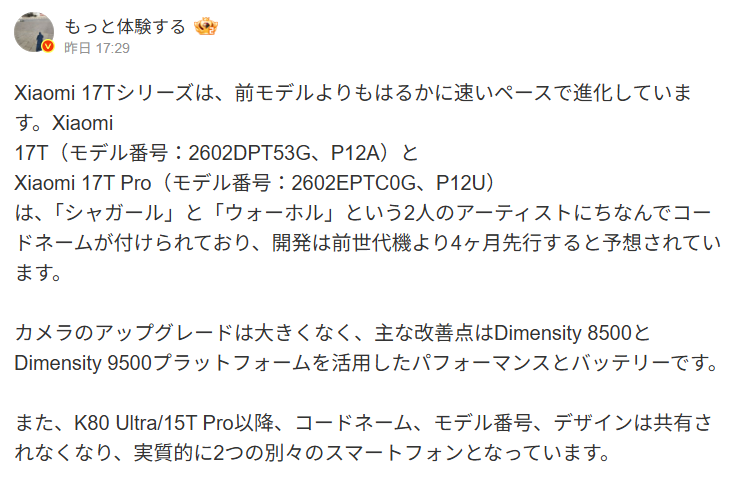 著名リーカーであるExperience moreの情報を紐解くと、Xiaomi 17Tシリーズのグローバル発売は、従来の9月から5月中旬〜下旬へと実に4ヶ月も早まる見込みだ。