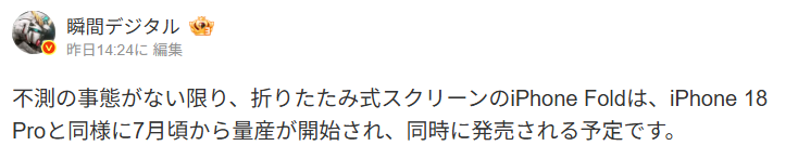 具体的なスケジュールが報道により遂に見えてきた。新型ヒンジ機構と専用コンポーネントを採用するこの折りたたみiPhoneは、今年7月からディスプレイの量産に入る。これはiPhone 18 Proのパネル製造と同じタイミング。秋の恒例イベントでのお披露目は確定的とみていい。