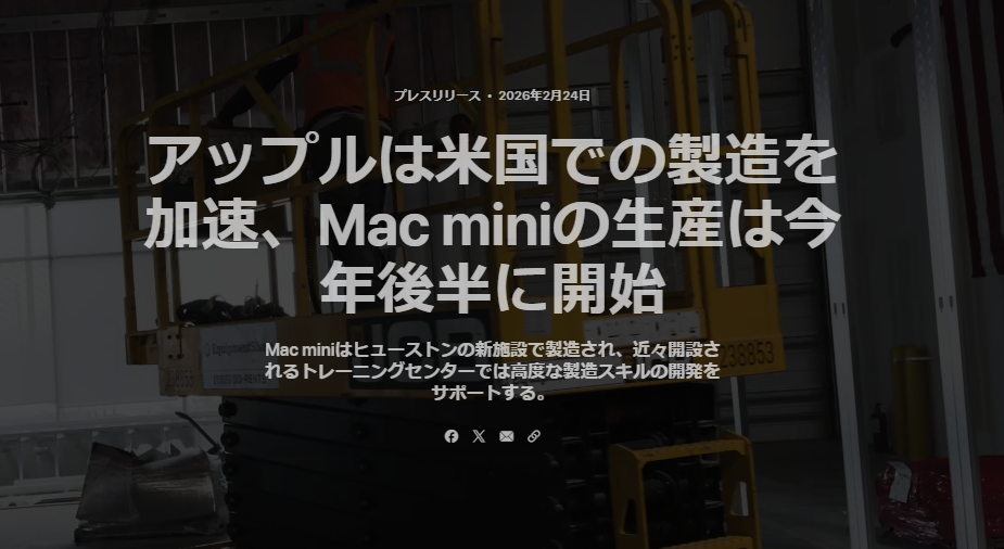 AppleがMac miniの一部を米国内で組み立てると発表した。テキサス州ヒューストンに新たな生産センターを設け、今年後半から稼働させる。