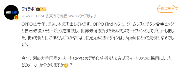 中国OPPOが3月17日に発表予定の「Find N6」は、単なる薄型モデルの投入ではない。今年後半に控えるサムスンの「Galaxy Z Fold8」が、そのデザイン要素を踏襲せざるを得ないほどの影響力を持つ、ゲームチェンジャーとなるからだ。