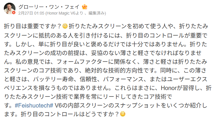 明日3月1日にスペインで開幕する「MWCバルセロナ」での正式発表を目前に控え、Honorの幹部フェイ・ワン氏が次世代機「Honor Magic V6」の実機画像をWeiboで電撃公開した。