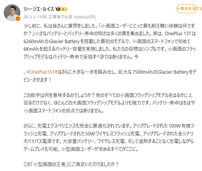OnePlus Chinaの李傑范社長が公式Weiboで明かした仕様は、まさに規格外。前モデルの13Tから一気に20%の容量アップを果たし、100Wの有線急速充電と50Wのワイヤレス充電をサポートする。