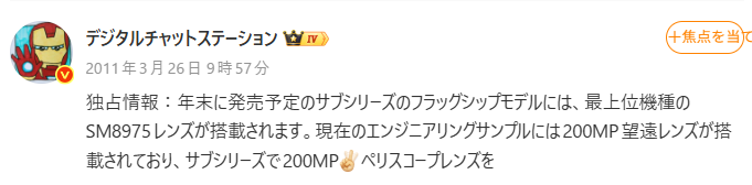 前モデルの50MP(1/2.76インチ)から、200MP(1/1.56インチ)のペリスコープ望遠カメラへの換装。センサーサイズの大型化と超高画素化の恩恵は、夜間撮影や高倍率ズーム時の解像感に直結する。VivoやOPPOなどの競合がカメラ性能でしのぎを削る中、望遠域での圧倒的なアドバンテージを取りに来た。