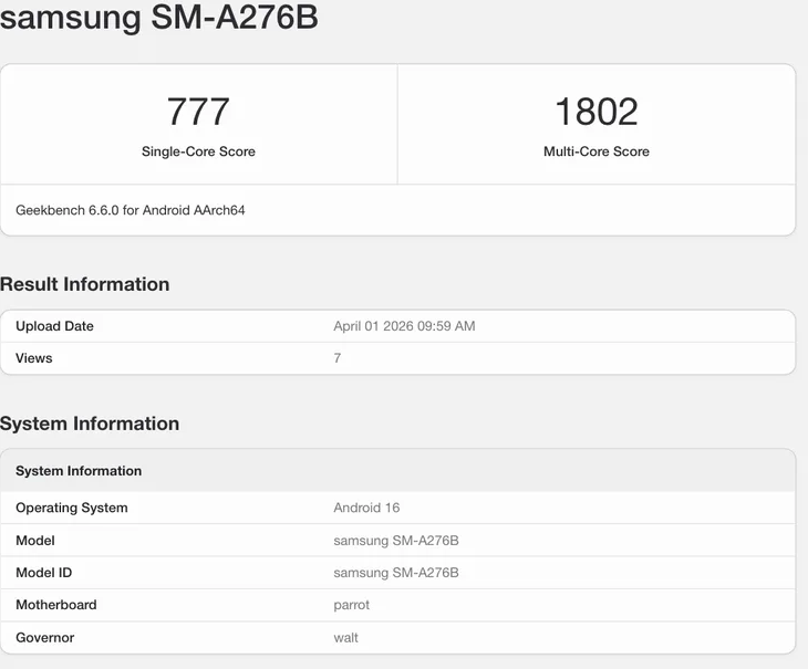 モデル番号「SM-A276B」として登録されたデータによると、4nmプロセス製造のプロセッサに6GBのRAMを組み合わせている。OSには最新のAndroid 16を搭載。以前からのリーク情報と照らし合わせると、5,000mAhの大容量バッテリーを引き継ぐ見込みだ。