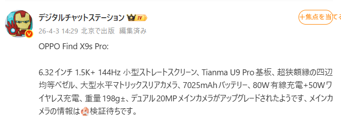 4月21日に中国での発売が公式にアナウンスされたOppoの新型フラッグシップ「Find X9s Pro」。その発表を目前に控え、驚異的なスペックの詳細がリークされた。最大の目玉は、妥協なきカメラ性能と常識を覆すバッテリー容量の両立。