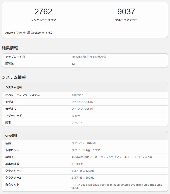 ベンチマークスコアは、シングルコアで2762、マルチコアで9037をマークした。