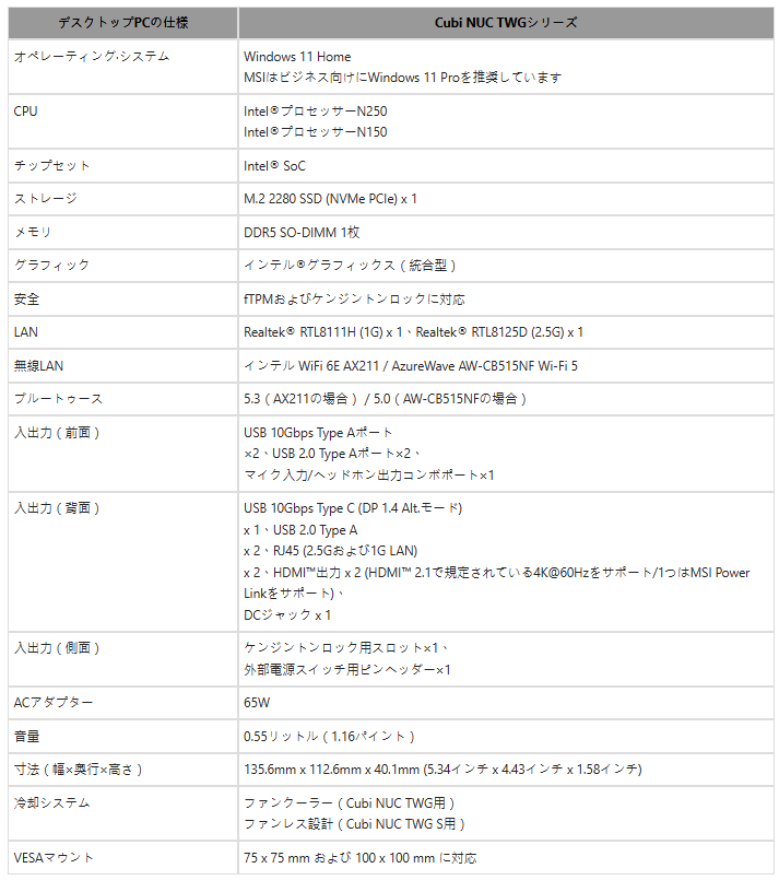 MSIが新たに発表したビジネス向けミニPC「Cubi NUC TWG」シリーズは、わずか0.55リットルという極小筐体にIntelのエントリー向けプロセッサ「Twin Lake」を詰め込んだ意欲作だ。