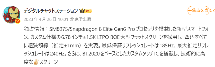 情報の中心は、BOEが供給する次世代LTPOディスプレイだ。1.5Kの解像度はもはや驚きではないが、特筆すべきは240Hzという驚異のリフレッシュレート。ゲーミングPCのハイエンドモニターに匹敵する滑らかさが、手のひらで実現される衝撃は大きい。